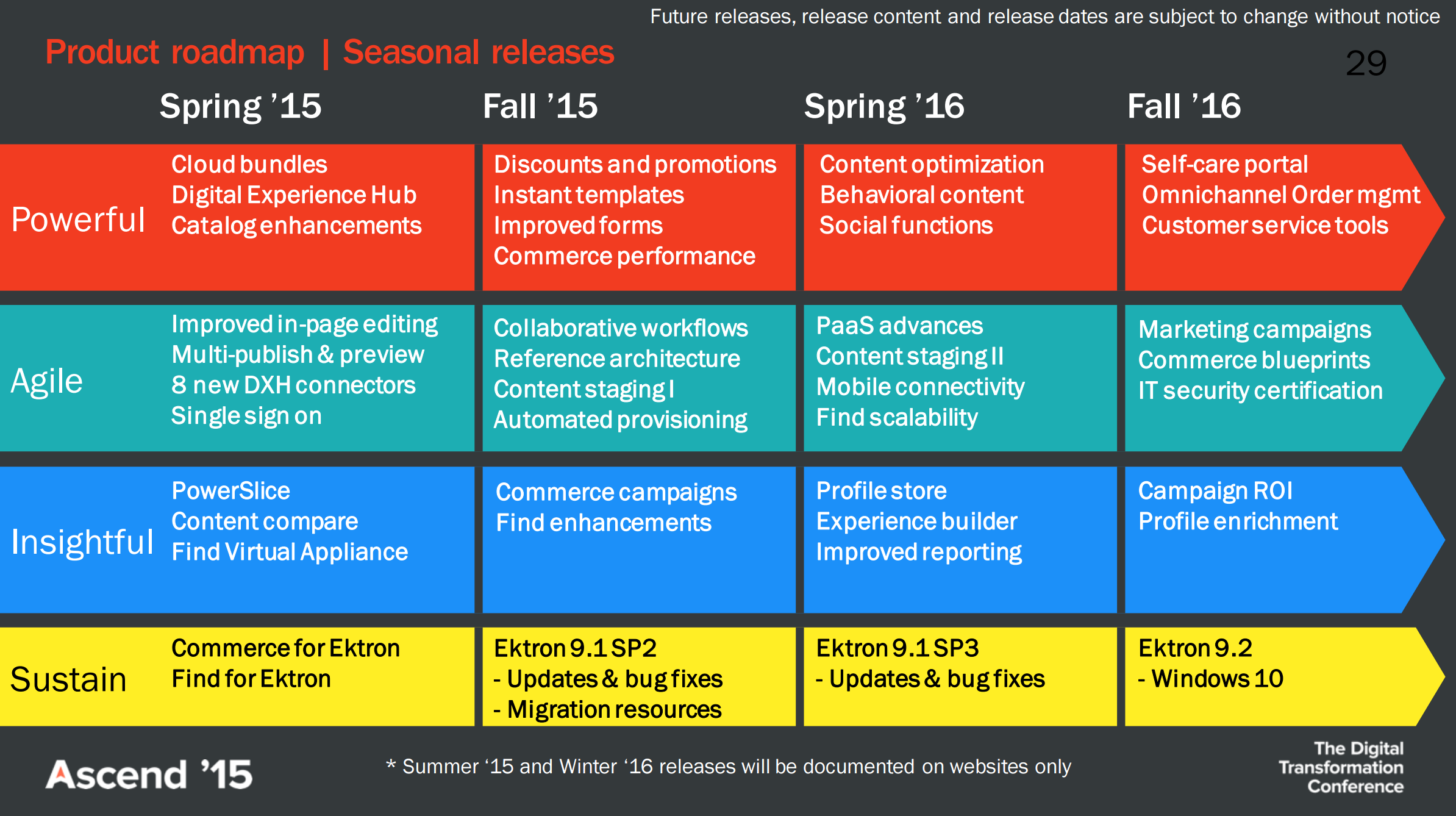 At the Ascend conference Bob Egner publicly showed the product road map for Episerver, and during the EMVP summit Episerver went into greater detail for each point on the roadmap.